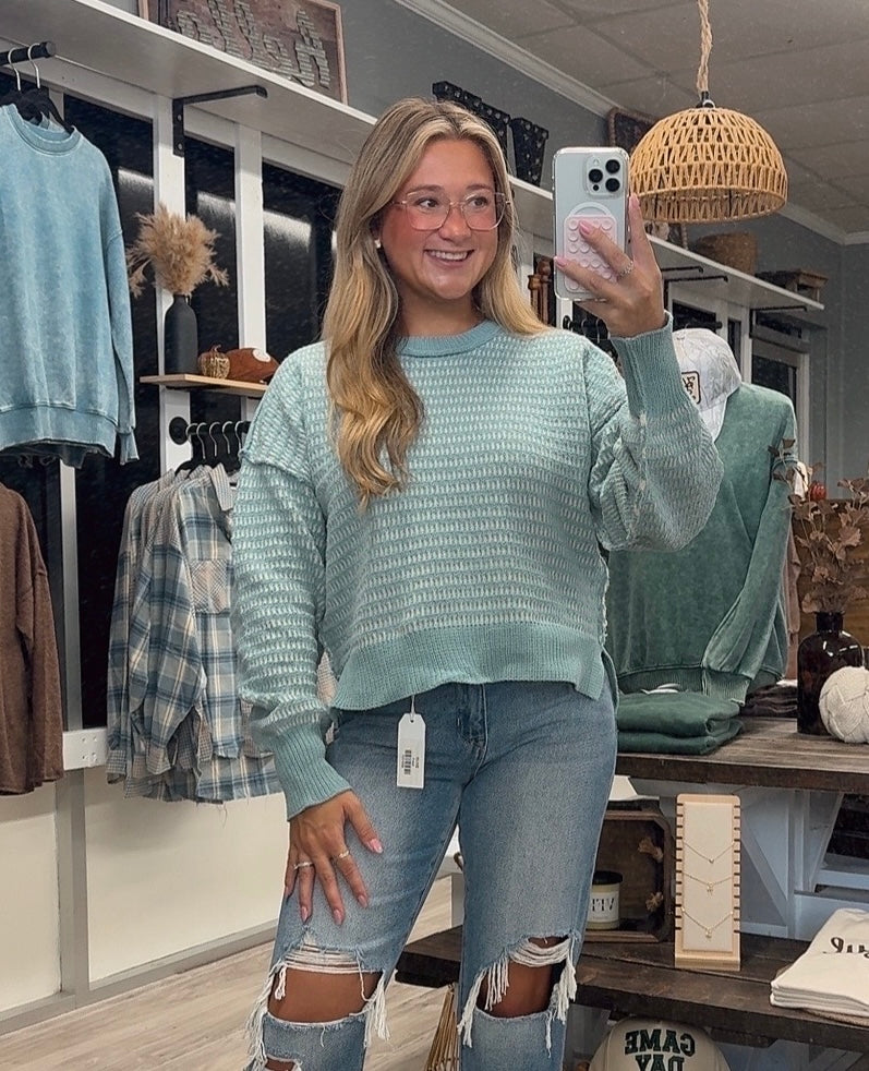 These are like chenille yall!!! SUPER soft and cozy!! I love all the details and mix of colors! True to size but relaxed! Cute either front tucked or not. This is the blue in color but we also have it in a pretty taupe color!