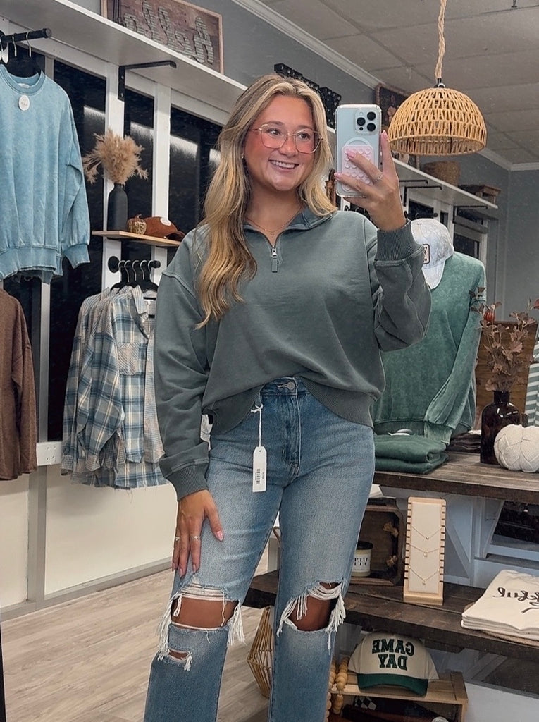 We loveeeee our mineral half zip pullovers over here!!! This one is in one of our fav colors, ash jade! These are a comfy relaxed fit and perfect with jeans or leggings!