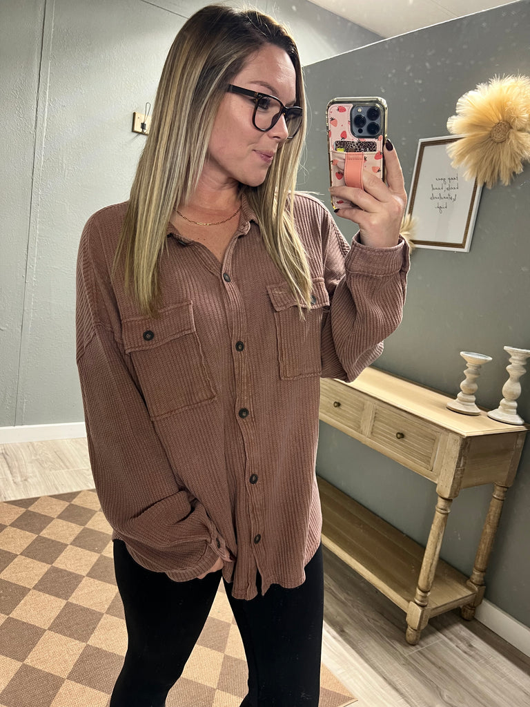 This colorrrrrr! It’s a pretty rusty mineral wash in color! Light weight and soft! They do run oversized as we are both in size smalls. Perfect open or closed!