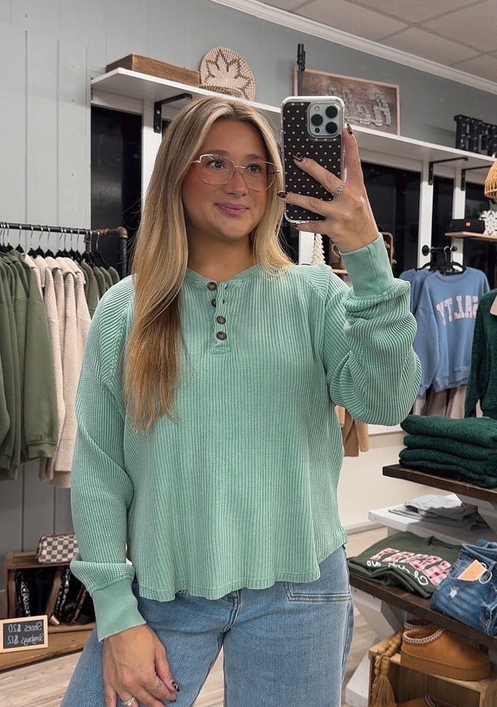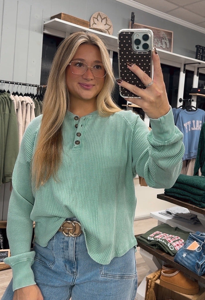 I’m obsessed with this color yall! It’s like a light colored emerald. It’s a waffle thermal style top and light weight. Perfect for layering.