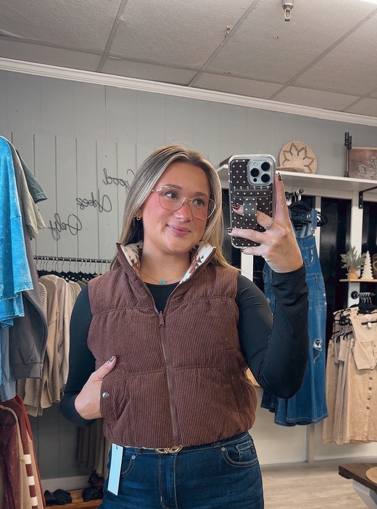 Look how fun this vest is!! It’s reversible! It’s got a chocolate brown corduroy side and then an Aztec fleece side! Love the options you have with this one!