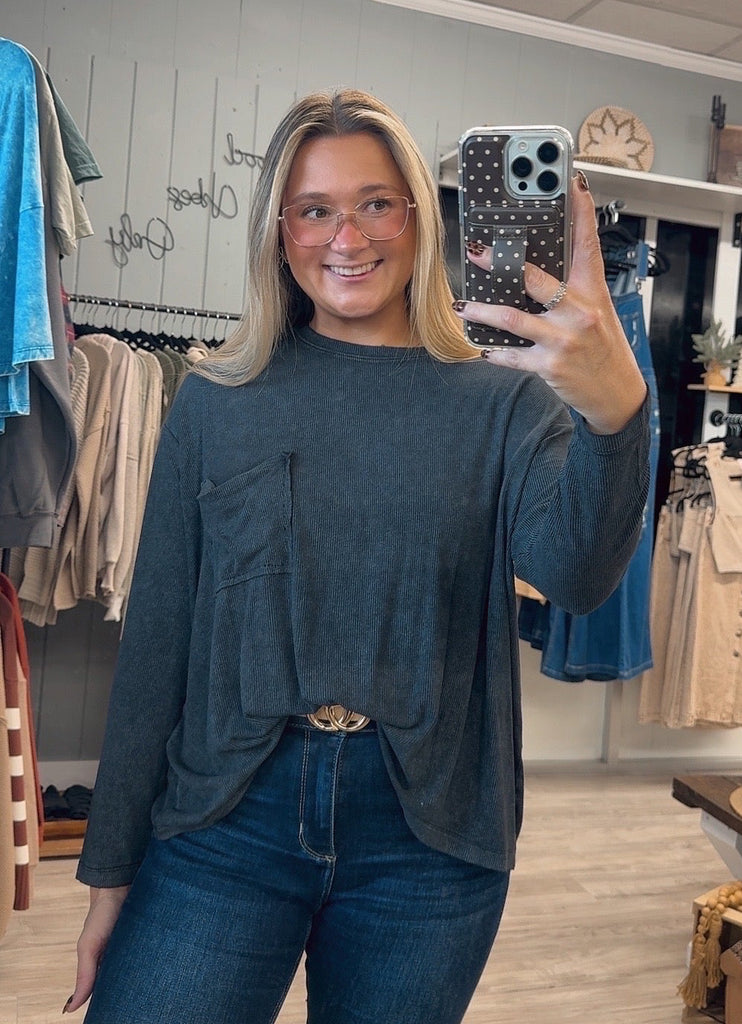 I have this same top but in short sleeve! I get so many compliments! It’s a black mineral wash and super super light weight y’all!