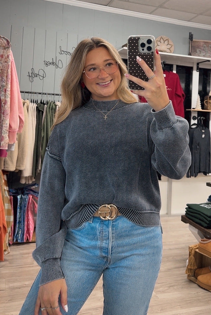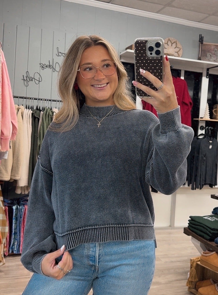 we love our mineral wash pieces ladies and this one is no different! It’s a pretty midnight color and mineral wash. Perfect dress up or down top